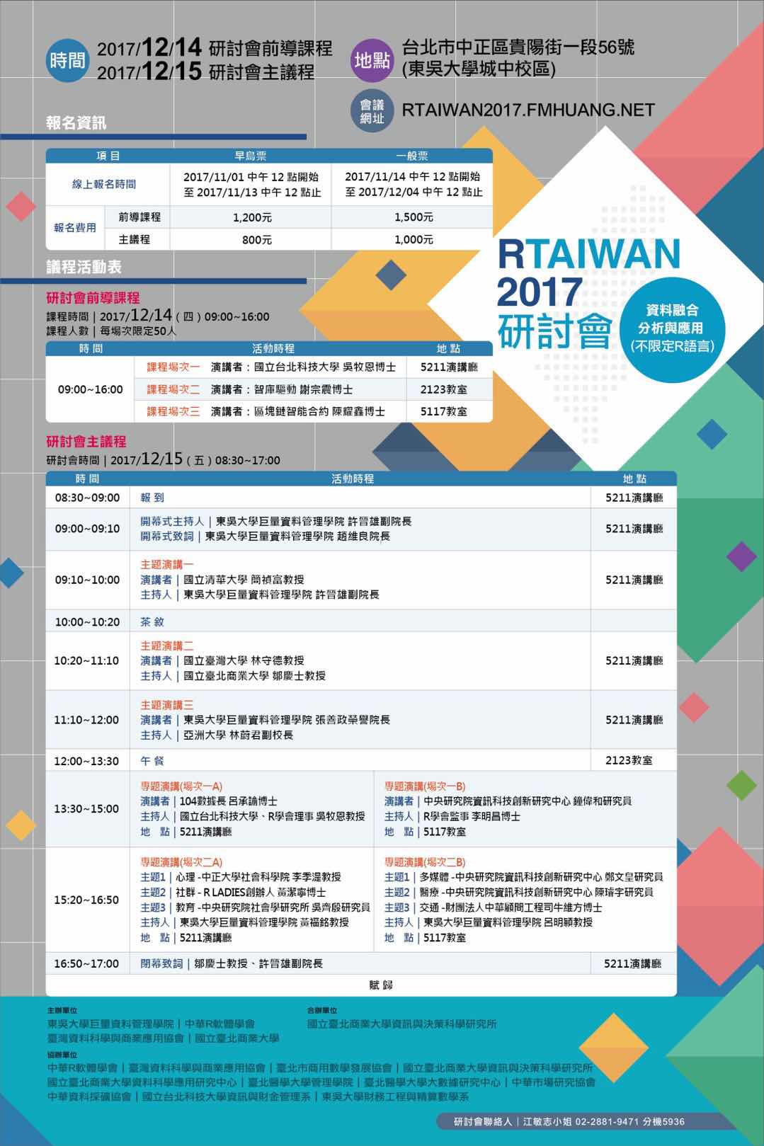 今年2017 R Taiwan研討會從雲端、產業根基與解析技術等開始談起,結合實務經驗豐富的業界專家與尖端研究的學界教授進行分享討論,期使 R軟體發揮槓桿作用,讓各行各業能從彈性的開源工具中取得資料加值的競爭優勢。